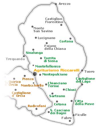 In Etruscan times, on the southern edge of the Valdichiana, stood the town of Chamars, powerful enough, in that period, to defeat Rome. In the historical centre, with its medieval architecture as well as styles of the granduchy, remains of the Roman structure can still be seen which were built on top of yhe pre-existing etruscan town. The Museo archeologico nazionale contains excellent Etruscan finds and Greek ceramics from the contryside around Chiusi; the funeral urns and sarcophagi are particularly interesting. It is possible to visit the catacombs and Etruscan necropolises; the tomba del Leone (6th century b.C.) and the tomba della Pellegrina (5th century b.C.) are open. Definitely worth visiting are the Museo della Cattedrale and the "labirinto di Porsenna", underground water passages built by the Etruscan and including a large cistern which leads to the romanic cathedral bell tower. There are four neighbouring localities: Macciano, Montallese, Montevenere and Querce al Pino. Festivals: The festival of Santa Mustiola with its palio delle Torri and the September wine festival.