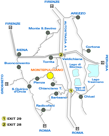 Prendere l’autostrada del Sole A1 , uscire a Chiusi-Chianciano Terme (n 29).